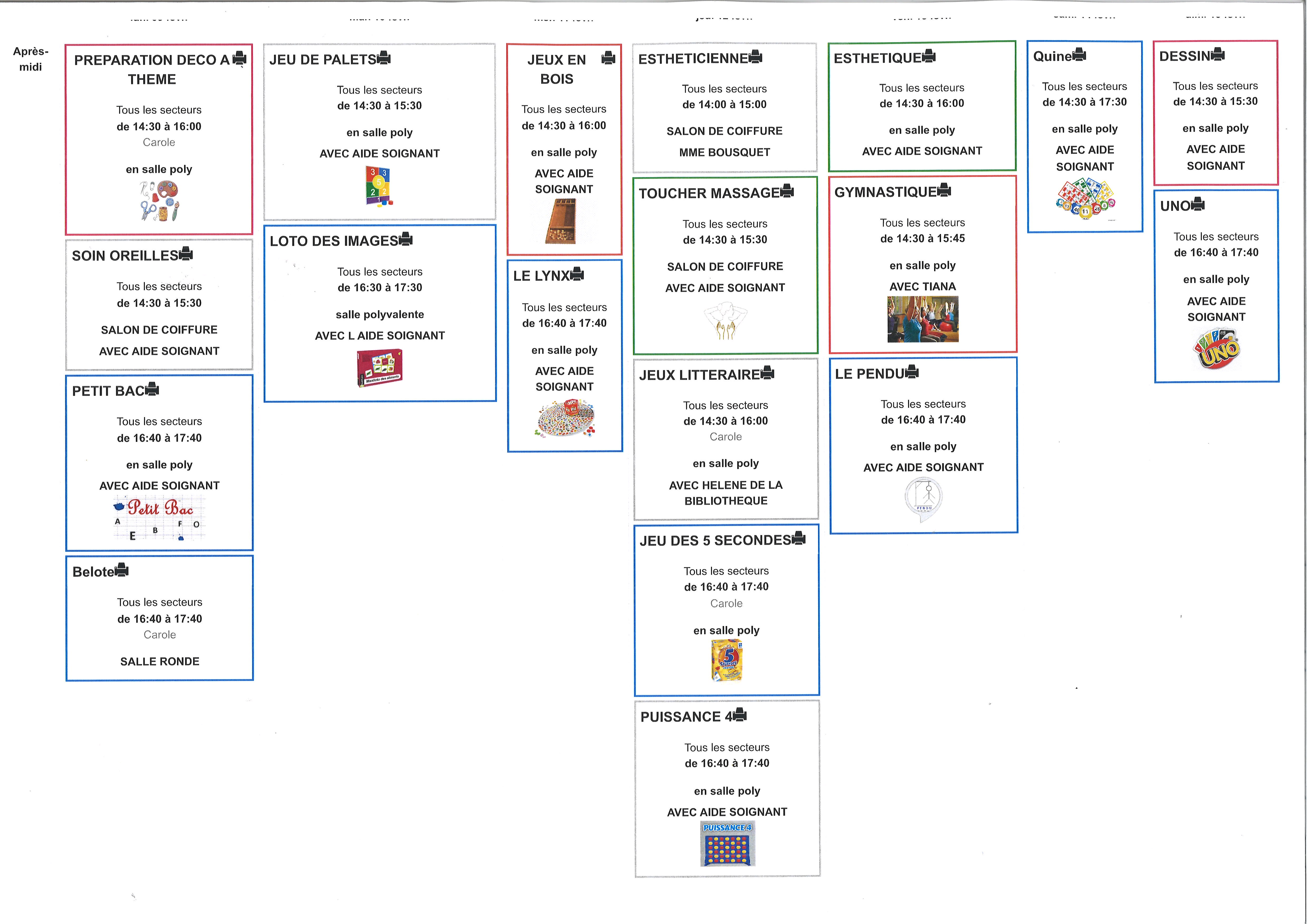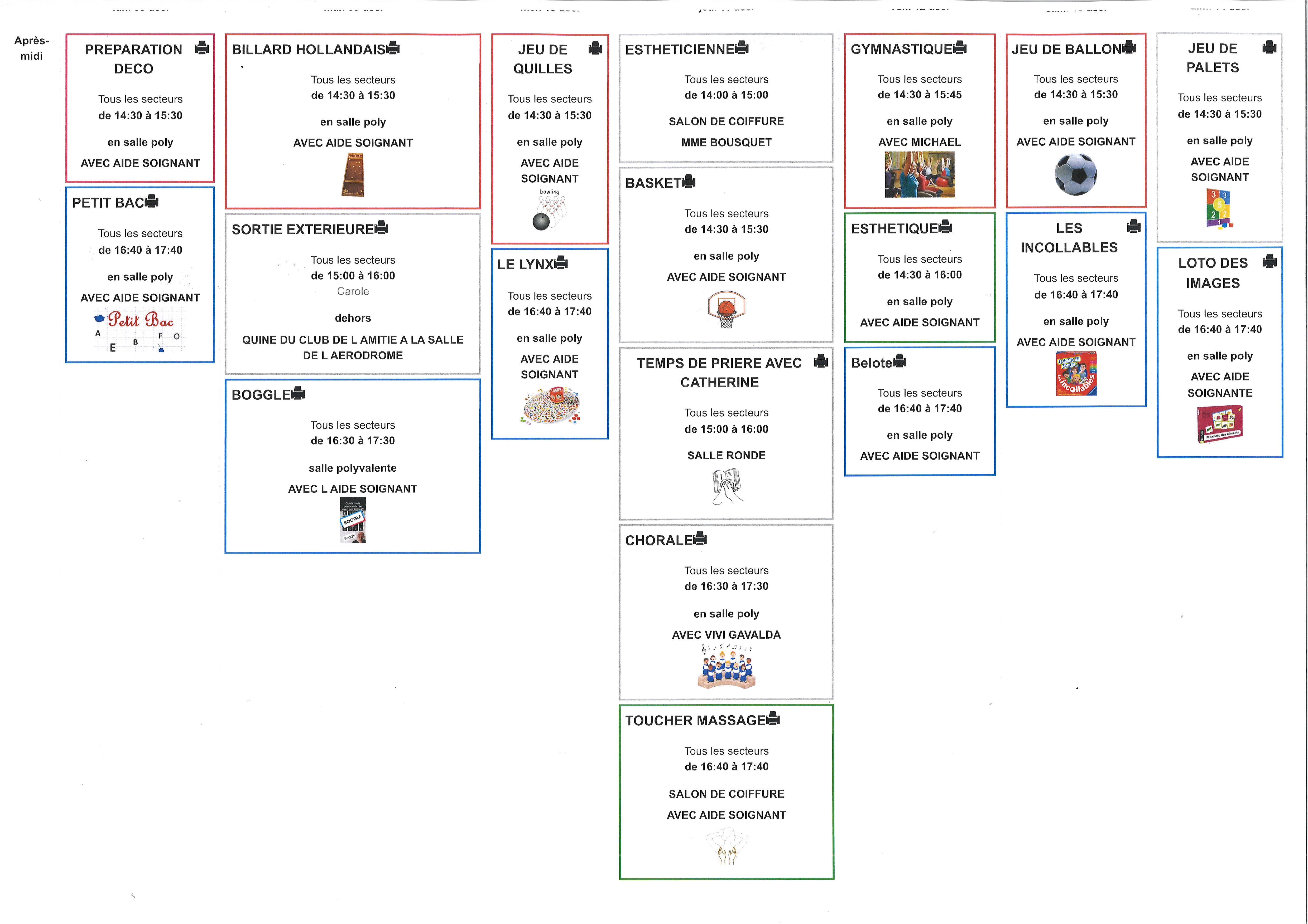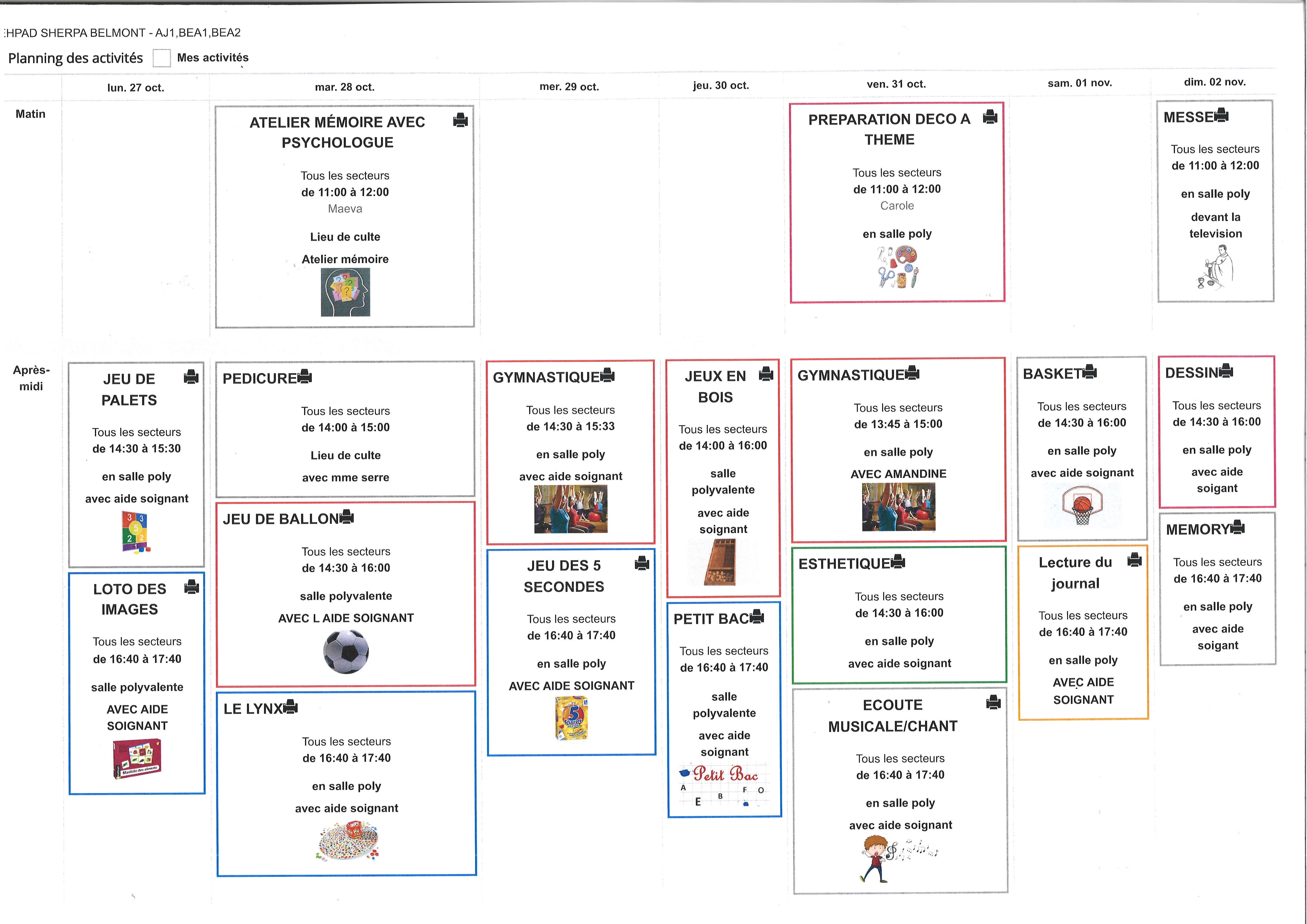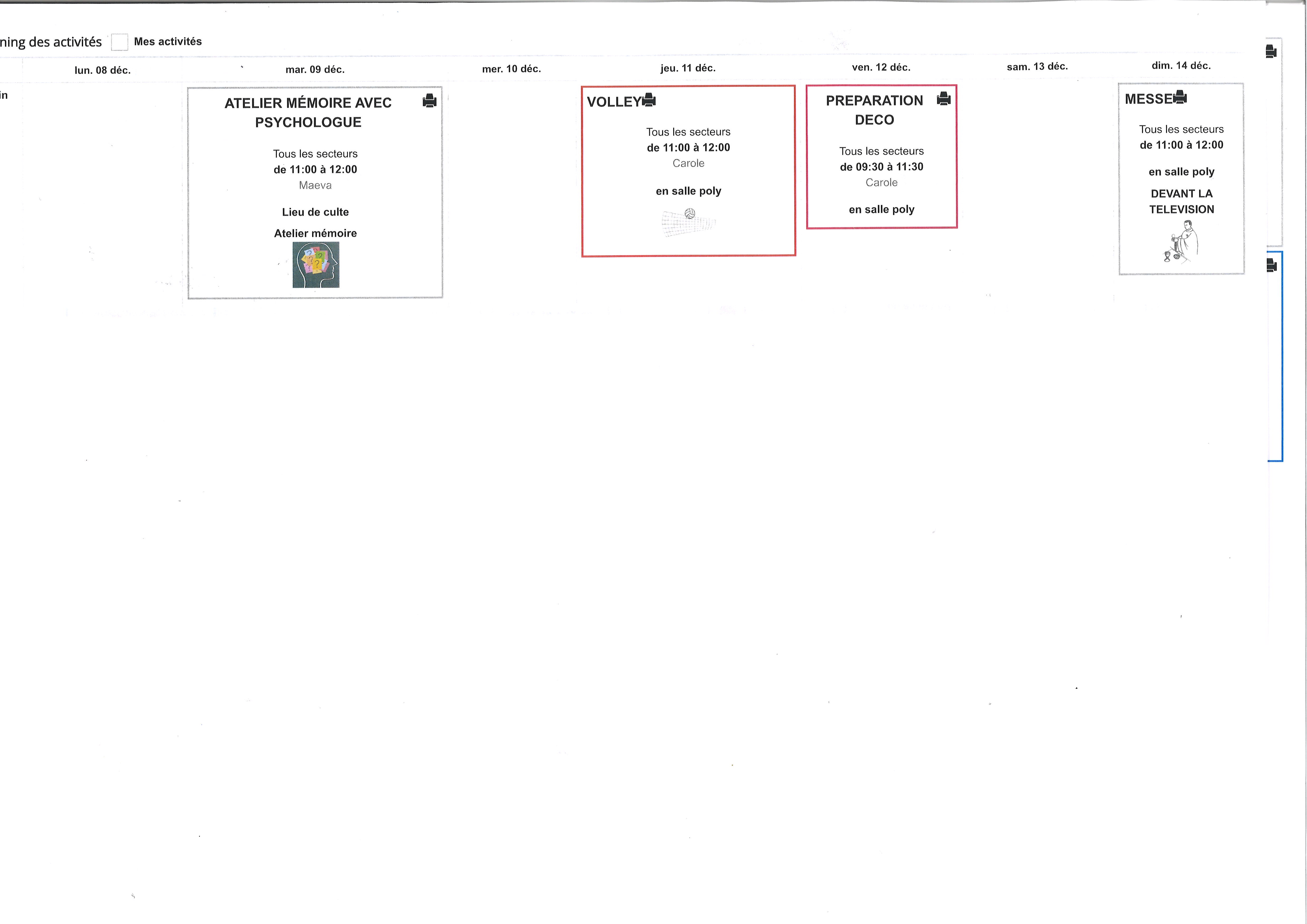 Sur les 2 sites, les résidents se voient proposer des activités identiques et récurrentes, qui permettent de donner certains repères aux personnes :